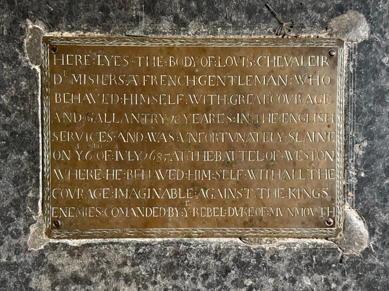 “HERE LYES THE BODY OF LOUIS CHEVALIER DE MISIERS A FRENCH GENTLEMAN BEHAVED HIMSELF WITH GREAT COURAGE AND GALLANTRY 18 YEARES IN THE ENGLISH SERVICE AND WAS UNFORTUNATELY SLAINE ON YE 6TH OF JULY 1685 AT BATTEL OF WESTON WHERE HE BEHAVED HIMSELF WITH ALL THE COURAGE IMAGINABLE AGAINST THE KINGS ENEMIES COMMANDED BY THE REBEL DUKE OF MONMOUTH.”